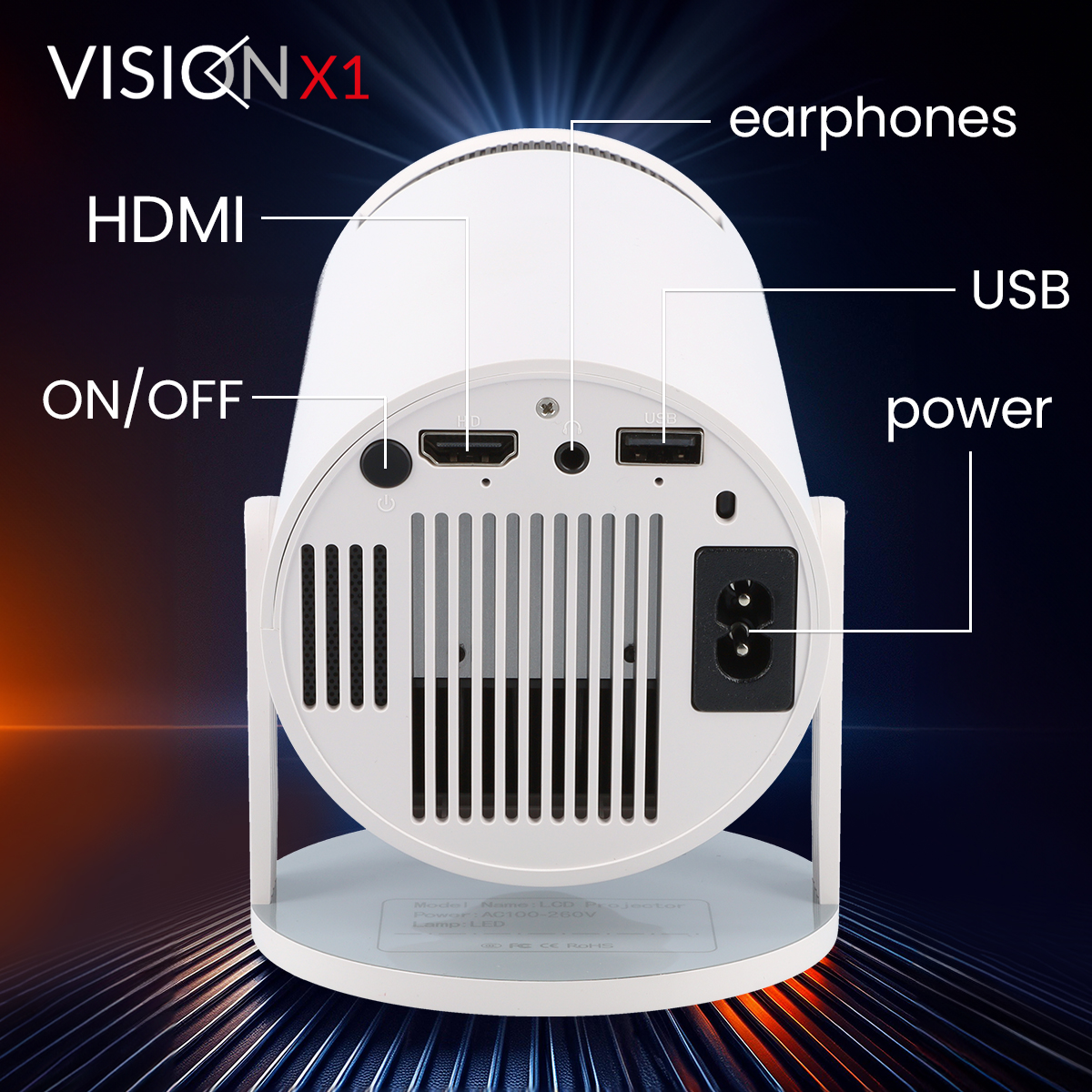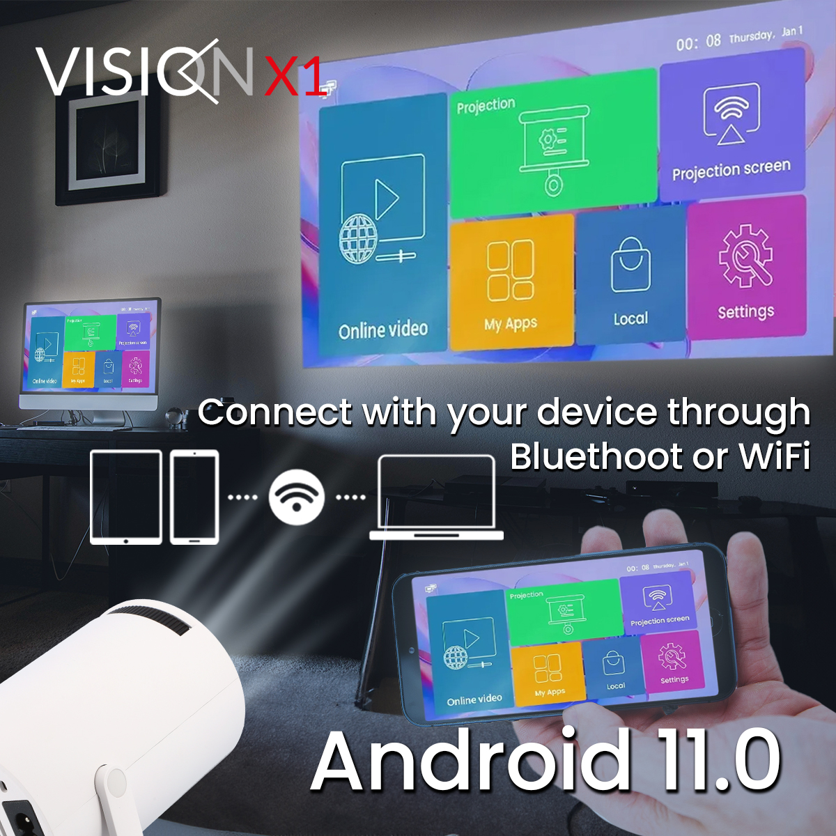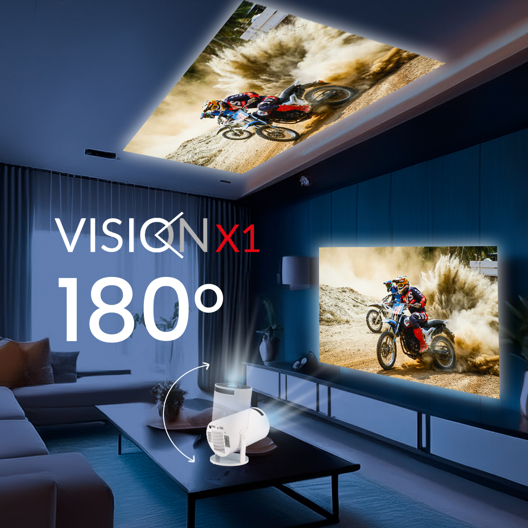 Obsługuje lustrzane odbicie ekranu z urządzeń mobilnych z systemem Android lub Apple. Podstawa projektora posiada obrotowy stojak o kącie 180°, który można wykorzystać od podłogi aż po sufit jako tło do projekcji.